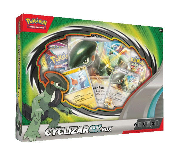 De Cyclizar EX Box bevat: 2 x Scarlet & Violet Base 1 x Silver Tempest & 1 x Lost Origin Pokémon TCG booster packs 2 promo kaarten 1 extra grote kaart met Cyclizar EX Packs kunnen verschillen van afbeelding