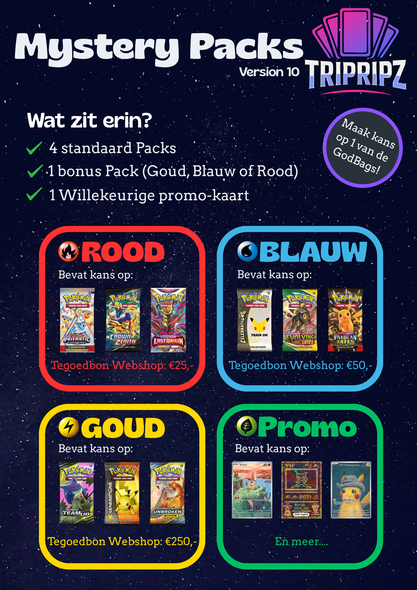Livestream Exclusief! Pak jij de chase pack?! De Mystery Pack bevat: 4 x Pokémon TCG booster packs (Scarlet & Violet, Sword & Shield) 1 x Extra Pokémon TCG booster packs *(Goud, Rood, Blauw) 1 x Promo kaart